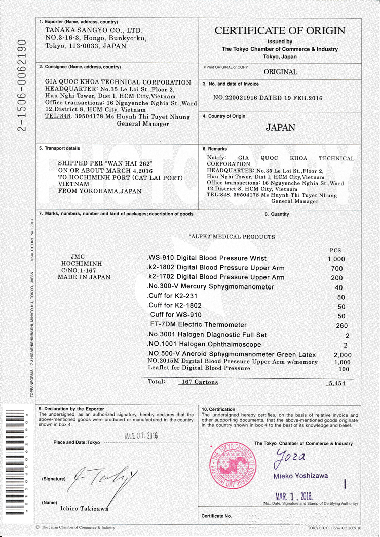 - Xuất xứ: Nhật Bản (kèm CO do Phòng Thương mại Nhật Bản cấp).